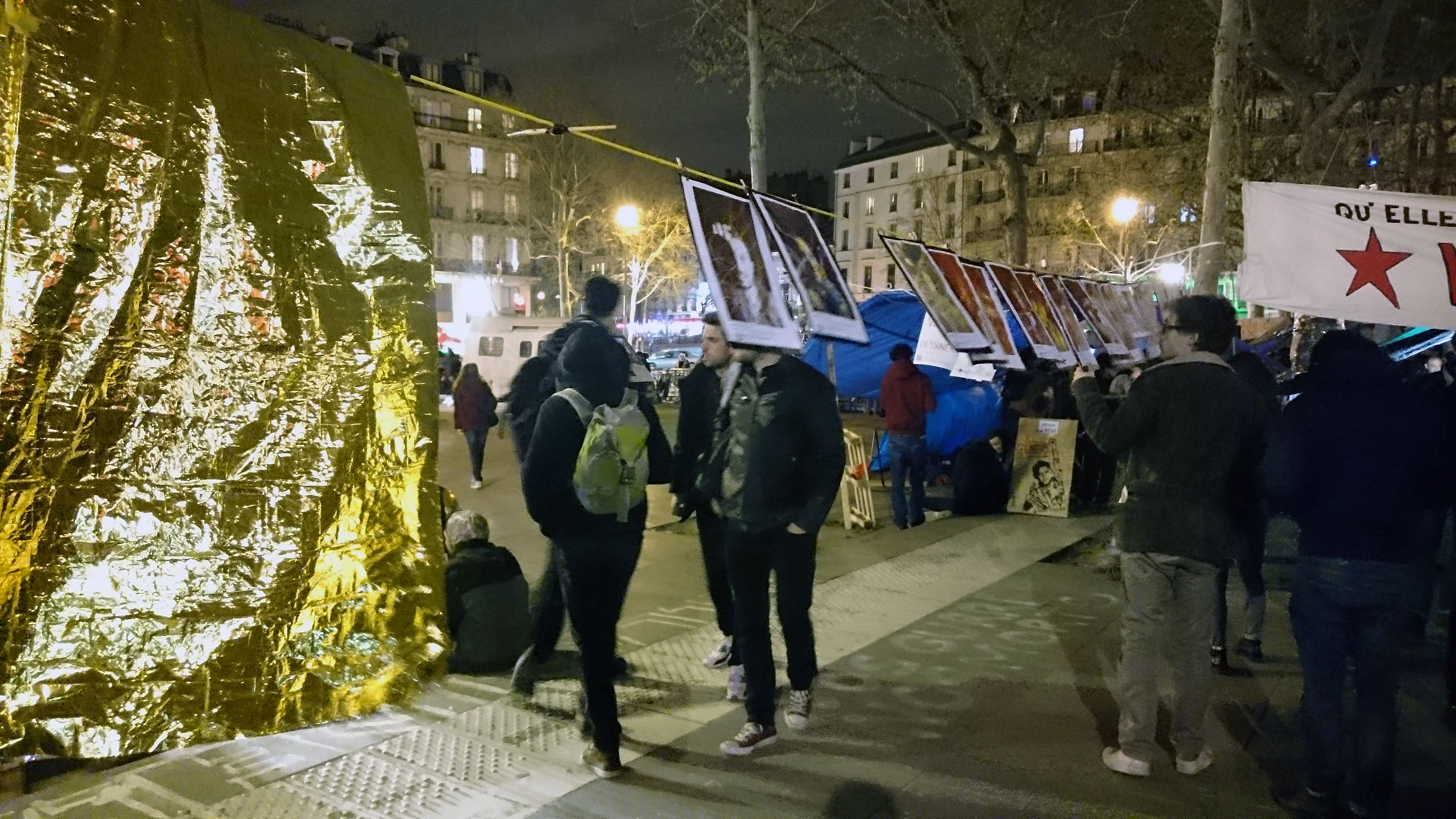 Le soir entre chien et loup, les photos prises la veille sont fixées sur un carton et accrochées sur la place de la République constituant une immense exposition in vivo, sauvage comme Nuit Debout.